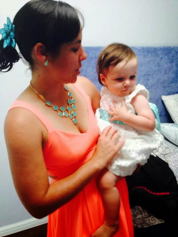 Zoe wore the dress as I was getting ready (20 minutes), for the ceremony (5 minutes) and about 10 minutes after. She didn't mind it if she was being held, but honestly, dresses before kids can walk are just stupid because it gets in there way so much and she certainly got annoyed about crawling. We made her outfit change very quickly 🙂